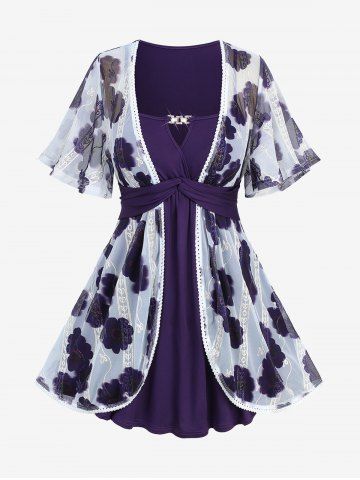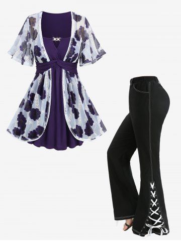 Tie Dye Flower Print Mesh Jacquard Embroidered 2 in 1 Top and Split Lace Up Pocket Flare Pants Plus Size Outfit - Purple