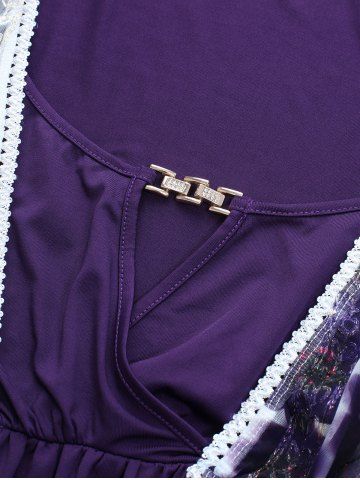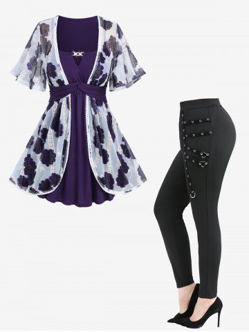 Tie Dye Flower Print Mesh Jacquard Embroidered 2 in 1 Top and Straps Grommet Leggings Plus Size Outfit - Purple