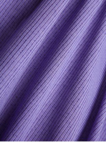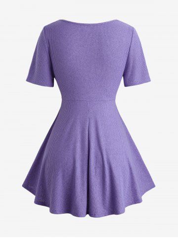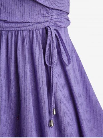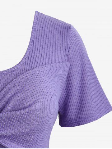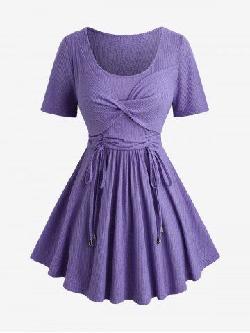 Twist Panel Cinched Wiast Top and Flocking Lace Up Sheer Mesh Leggings Plus Size Outfit - Purple