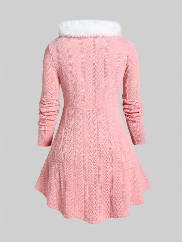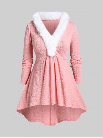 A*****s5Plus Size Faux-fur Trim Textured High Low KnitwearColor: LIGHT PINK Size: 3X | US 22-24Love this shirt. So soft and warm. The color is a soft pink. Fix great on me. I am 5'3.