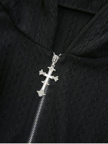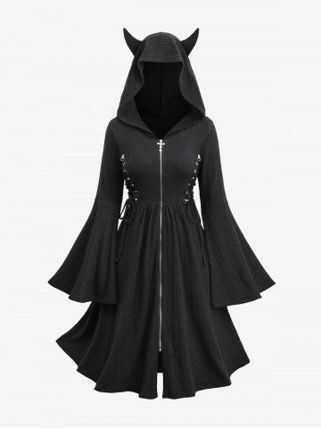 Plus Size Flare Sleeves Cross Zipper Cable Knit Lace Up Devil Hooded Solid Coat - Black - L | Us 12