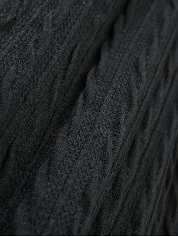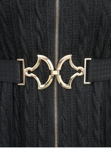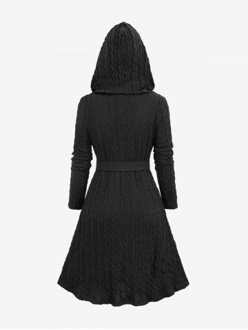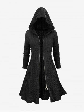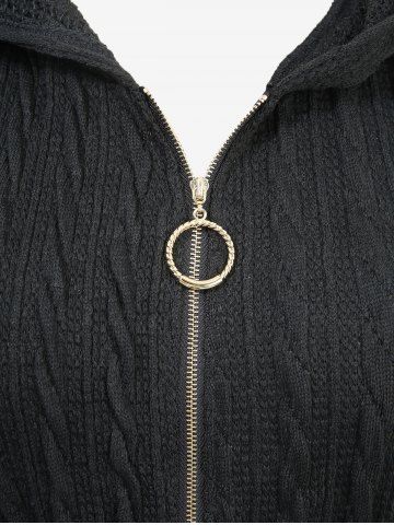 Plus Size Full Zipper Cable Knit Textured Solid Hooded Long Sleeve Sweater Coat with Scalloped Sector Belt - Black - M | Us 10