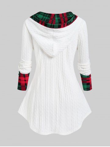 r*****i5Plus Size Plaid Textured Cable Knit Patchwork Asymmetrical Neck Ruched Hooded SweaterColor: WHITE Size: 4X | US 26-28This is probably the most comfortable hoodie I've ever worn. It's also really stylish. Not the biggest fan of the asymmetrical design of the sleeves (you can kinda tell in the picture but I didn't notice until I had worn it a couple of times).