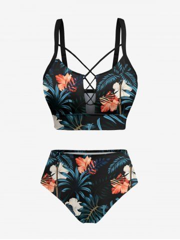 Tropical Leaf Hibiscus Flower Print Hawaii Swim Bottom - Black - 5x