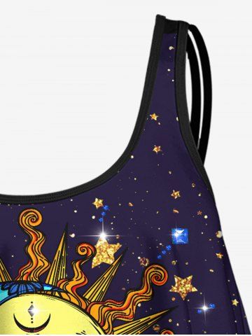 3D Sun Moon Star Glitter Print Overlay Spaghetti Strap Tankini Top - Deep Blue - 5x