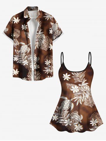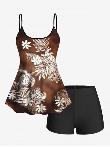 Branch Leaves Floral Turtle Tie Dye Ombre Print Hawaii Sea Creatures Tankini Top - Coffee - S