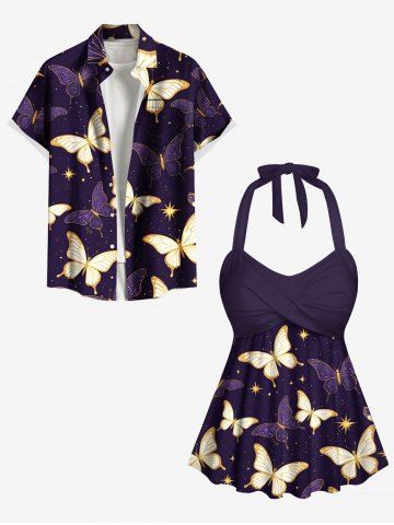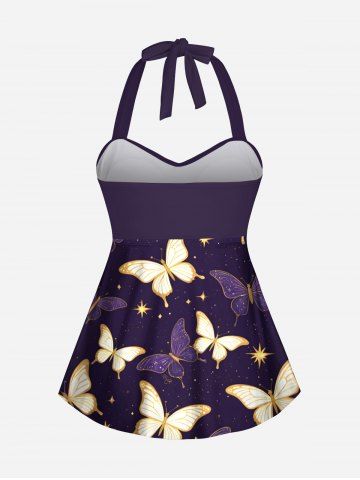 Butterfly Stars Galaxy Print Twist Halter Backless Tankini Top - Concord - L