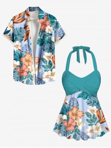 Swim Tops > Colorful Tropical Leaf Hibiscus Flower Print Hawaii Twist Halter Backless Tankini Top