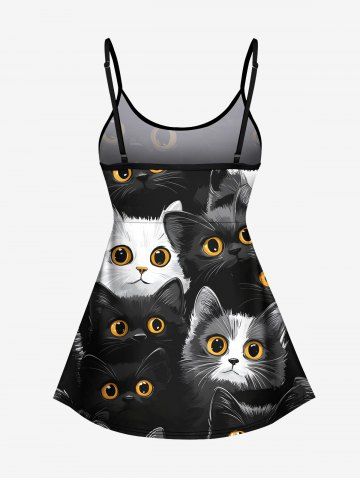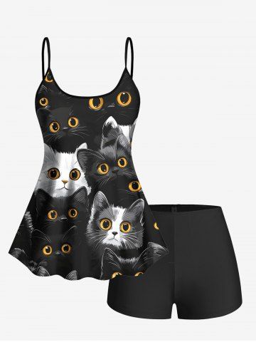 Cute Two Tone Cat Print Tankini Top(Adjustable Shoulder Strap) - Black - 2x