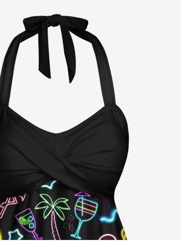 Fashion Glitter Neon Flamingo Pineapple Coconut Tree Stars Print Hawaii Twist Halter Backless Tankini Top - Black - Xs