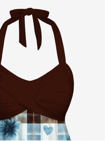 Swim Tops > Floral Leaf Branch Plaid Print Hawaii Twist Halter Backless Tankini Top