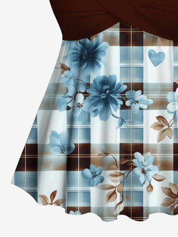 Floral Leaf Branch Plaid Print Hawaii Twist Halter Backless Tankini Top - Blue - 4x