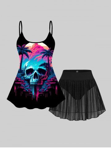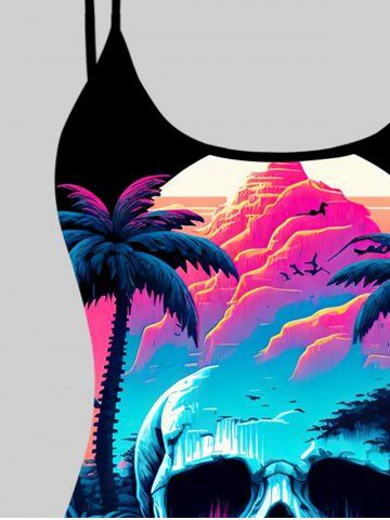 Plus Size Coconut Tree Ombre Skull Mountain Cave Print Tankini Top(Adjustable Shoulder Strap) - Black - S