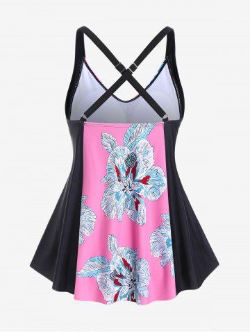 Plus Size Floral Print Colorblock Padded Swim Tankini Top - Black - 1x | Us 14-16