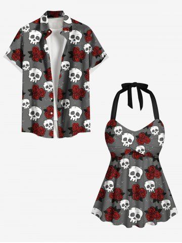 Plus Size Skull Rose Flower Galaxy Print Hawaii Twist Halter Backless Tankini Top - Gray - S