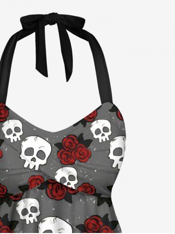 Plus Size Skull Rose Flower Galaxy Print Hawaii Twist Halter Backless Tankini Top - Gray - 4x