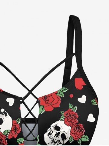 Skull Rose Flower Leaf Heart Print Hawaii Lace Up Braided Tankini Top(Adjustable Shoulder Strap) - Black - Xxs