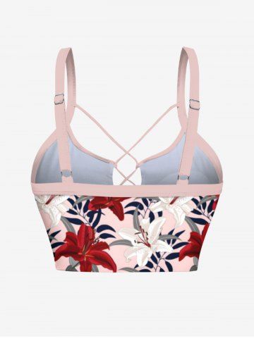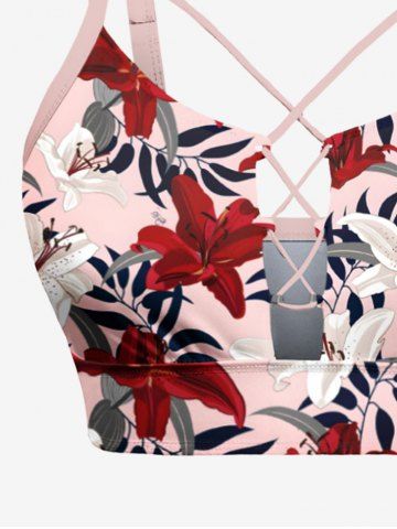 Tropical Leaf Hibiscus Flower Print Hawaii Lace Up Tankini Top(Adjustable Shoulder Strap) - Red - Xs