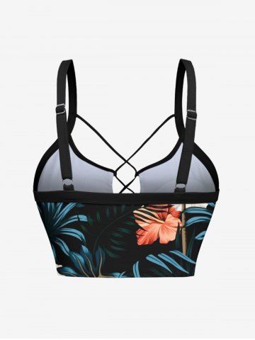 Tropical Leaf Hibiscus Flower Print Hawaii Lace Up Tankini Top(Adjustable Shoulder Strap) - Black - 5x