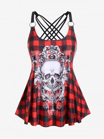 Gothic Skull Plaid Padded Boyleg Strappy Modest Tankini Swimsuit - Red - 1x | Us 14-16