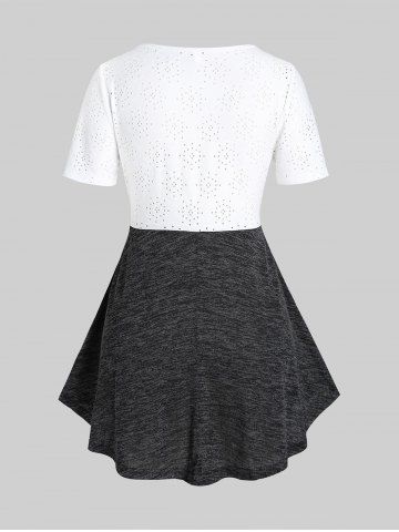 B*****b4Plus Size Contrast Lace Applique Tunic TeeColor: DARK GRAY Size: 3XPretty solid grey top with a button front and lace sleeve inserts that match the black pants with the same inserts! The lace is nice and thick, high quality design and made very well. The material is soft and comfortable. Shipped fast and packaged nicely.