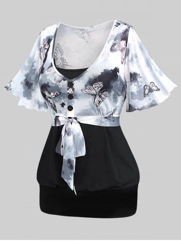 A*****a5Plus Size Buckle Cami Top and Ink Painting Butterfly Print Tie Buttons T-shirtColor: BLACK Size: 1X | US 14-16Super soft and comfortable. The white sheet top was so soft I didn’t feel it on. My only issue is the black tank make me looked pregnant since I’m cinched at the bottom.