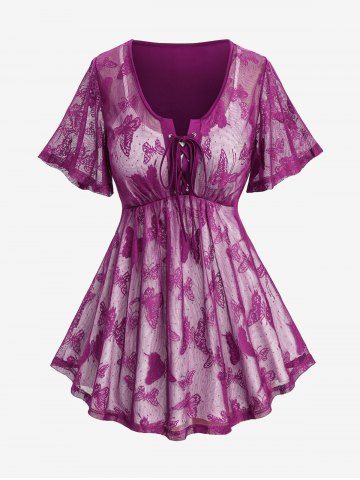 Plus Size T-shirts > Plus Size Butterfly Lace Overlay Lace-up 2 in 1 Tee