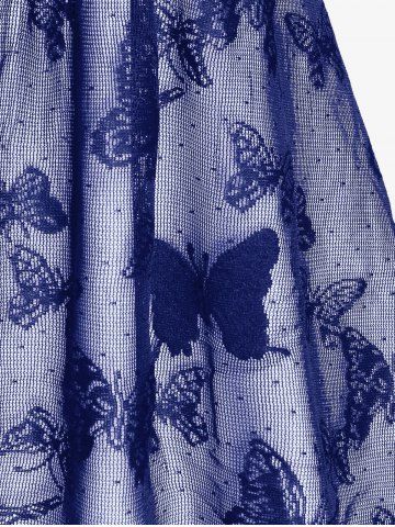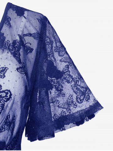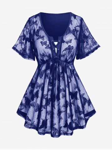 Plus Size Butterfly Lace Overlay Lace-up 2 in 1 Tee - Deep Blue - L | Us 12