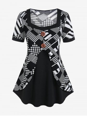 Plus Size Checkerboard Stripes Square Neck Colorblock T Shirt - Black - 1x | Us 14-16