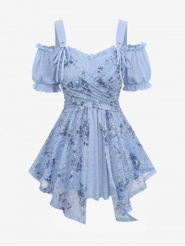 Plus Size Cold Shoulder Puff Sleeves Gilding Rose Flower Lace Overlay Layered Crossover Top - Light Blue - 1x | Us 14-16