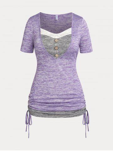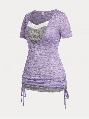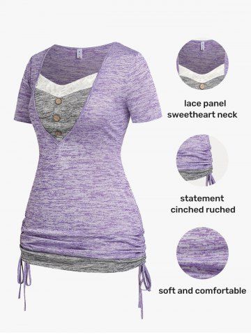 p*****u4Plus Size & Curve Lace Panel Cinched Ruched Space Dye T ShirtColor: LIGHT PURPLE Size: 1X | US 14-16thought i ordered an xl but i guess i order a 1x. so it is a little big but I'm sure it will shrink to perfect size after a few washes