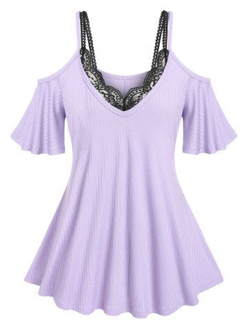 B*****b5Plus Size & Curve Ribbed Open Shoulder T-shirt and Lace Bralette Top SetColor: LIGHT PURPLE Size: 3XLovely shade of purple summer top with a bralette to wear underneath so you have a peek of lace showing to catch the eye! The fabric is so soft and comfortable, perfect fit, shipped fast and packaged nicely. High quality design and made very well!