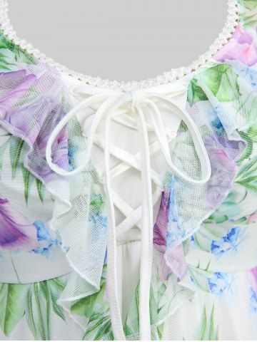 Plus Size Floral Leaf Print Mesh Ruffles Lace Up Layered Top - White - 1x | Us 14-16