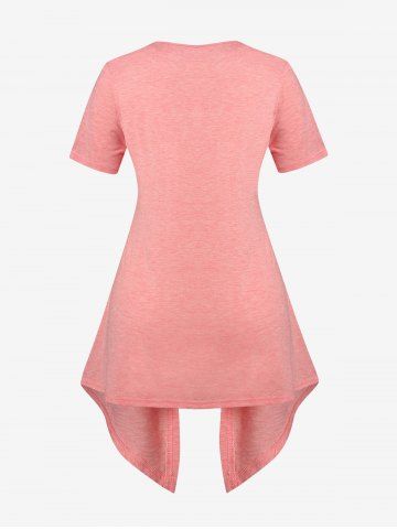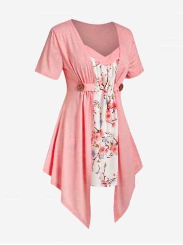 d*****n5Plus Size Floral Print Faux Twinset Irregular T ShirtColor: LIGHT PINK Size: L | US 12I really like this one too. It's thin and light weight. Very charming and petite looking, very feminine piece. The over piece is like cotton. Very soft. The front shirt piece is another type of fabric that I don't know but it feels good. This is a large. The front shirt piece doesn't go all the way around. Just to the sides and then it's sewn into the other piece. The only adjustment that I had to make was to pin up the spaghetti straps to lift up the front more. I ordered this on July 7, 2022 and received it yesterday on July 21, 2022. I give you the exact date and year so that way you know when it was and not guessing the year or anything so you know exactly how many days. I live in Maryland USA if that helps anyone. Rosegal is far away from me. I am 5 foot and 2 inches and I weigh 160 lbs. My belly sticks out more than I want but in person you can't tell. I wear a size 12= 13 jeans and you can see how nicely this lays in my hips. But grandmomma got back and I can't hide it. lol. As I am with all of my items, I recommend this shirt. You can wear it casually or a dress down. Wear it basically anywhere. The outer layer won't go over my chest area. That part is too small. But I like the open look.