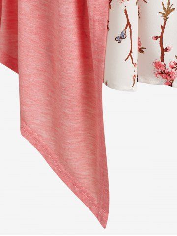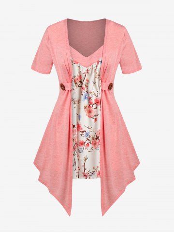 d*****n5Plus Size Floral Print Faux Twinset Irregular T ShirtColor: LIGHT PINK Size: L | US 12I really like this one too. It's thin and light weight. Very charming and petite looking, very feminine piece. The over piece is like cotton. Very soft. The front shirt piece is another type of fabric that I don't know but it feels good. This is a large. The front shirt piece doesn't go all the way around. Just to the sides and then it's sewn into the other piece. The only adjustment that I had to make was to pin up the spaghetti straps to lift up the front more. I ordered this on July 7, 2022 and received it yesterday on July 21, 2022. I give you the exact date and year so that way you know when it was and not guessing the year or anything so you know exactly how many days. I live in Maryland USA if that helps anyone. Rosegal is far away from me. I am 5 foot and 2 inches and I weigh 160 lbs. My belly sticks out more than I want but in person you can't tell. I wear a size 12= 13 jeans and you can see how nicely this lays in my hips. But grandmomma got back and I can't hide it. lol. As I am with all of my items, I recommend this shirt. You can wear it casually or a dress down. Wear it basically anywhere. The outer layer won't go over my chest area. That part is too small. But I like the open look.