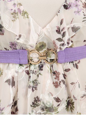 Plus Size T-shirts > Plus Size Flutter Sleeves Colorful Floral Embroidered Ruffles Layered Lace Trim 2 in 1 Chiffon Belted Top