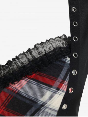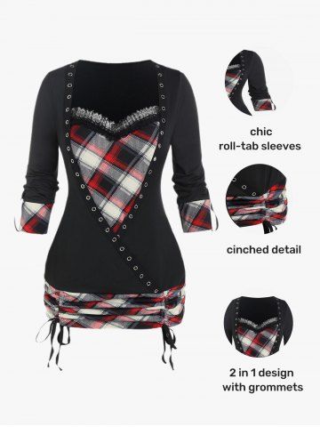 l*****a5Plus Size Lace Trim Ruched Cinched Grommets Plaid T-shirtColor: BLACK Size: L | US 12It is a beautiful blouse, very comfy, a little stretchy for comfort. My bust is 38 DDD so it seemed like the boobs were sticking out more so I used a string and tied it up to where I felt comfortable.