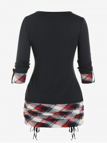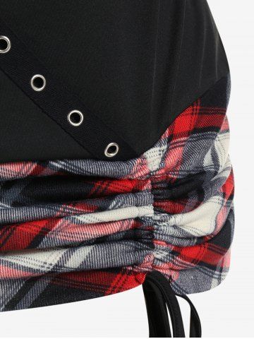 l*****a5Plus Size Lace Trim Ruched Cinched Grommets Plaid T-shirtColor: BLACK Size: L | US 12It is a beautiful blouse, very comfy, a little stretchy for comfort. My bust is 38 DDD so it seemed like the boobs were sticking out more so I used a string and tied it up to where I felt comfortable.