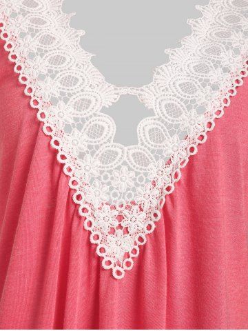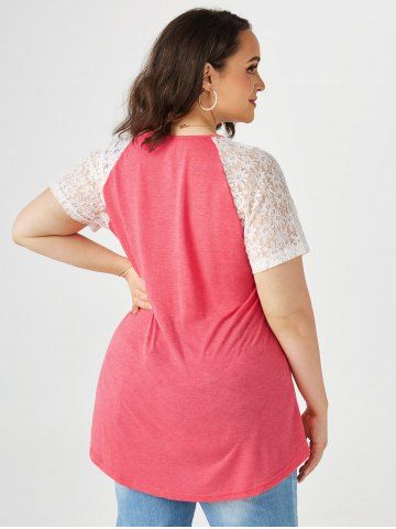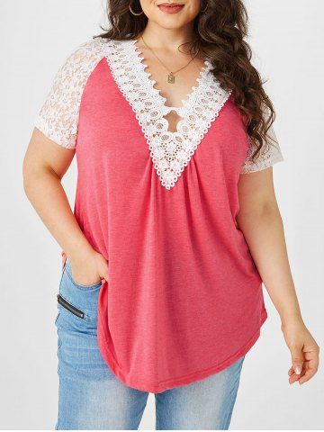 B*****b5Plus Size Lace Panel Plunging Neck TeeColor: LIGHT PINK Size: 3XI have a tank underneath this darling top so please excuse that. This is so pretty with sparkles added to the center of the flowers on the sleeves, makes the top really stand out. The lace on the sleeves is really sturdy and will last, the vee neck lace is a heavier matetial which is exceptional. The material is soft and comfortable. Shipped fast and packaged nicely. High quality design and made very well!