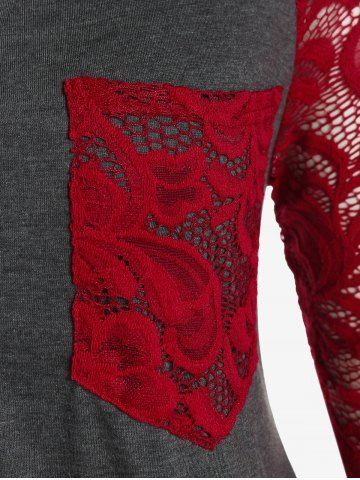 d*****h5Plus Size Lace Panel Pocket Raglan Sleeves V Notched T ShirtColor: DARK GRAY Size: 3X | US 22-24This one fits nice, and it feels nice. The lace doesn't feel itchy I'm a size 44D and that's the kind of cleavage that shows when I bend over