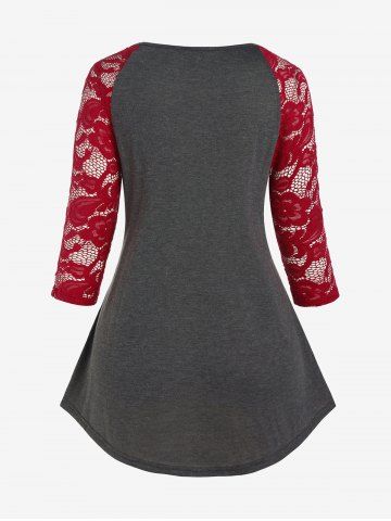 d*****h5Plus Size Lace Panel Pocket Raglan Sleeves V Notched T ShirtColor: DARK GRAY Size: 3X | US 22-24This one fits nice, and it feels nice. The lace doesn't feel itchy I'm a size 44D and that's the kind of cleavage that shows when I bend over