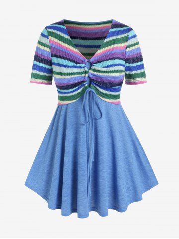 Plus Size T-shirts > Plus Size Lace Up Striped Knitted Top and Solid Tank Top Set