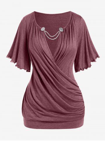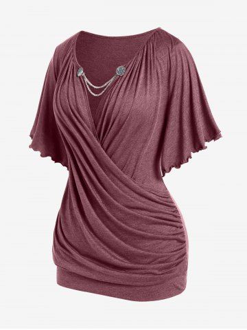 Plus Size T-shirts > Plus Size Lettuce Ruched Chain Embellished Plunging Blouson Tee