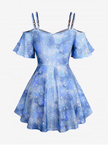 Plus Size T-shirts > Plus Size Ombre Tie Dye Galaxy Moon Star Print Twist Chains Hollow Out Cold Shoulder Top