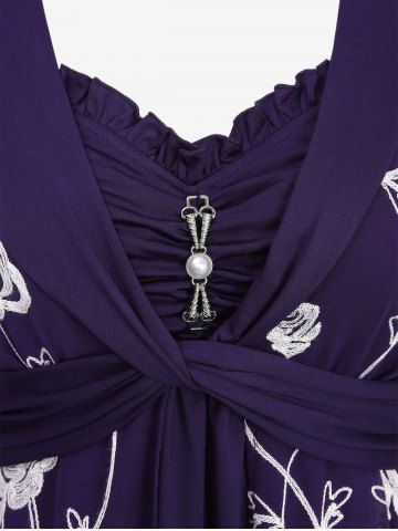 n*****75Plus Size Pearl Buckle Panel Ruched Twist Ruffles Embroidery Rose Flowers Chiffon 2 In 1 TopColor: DEEP BLUE Size: M | US 10gorgeous stretchy top, sits a little low, but the print is stunning. the fabric is soft. had several compliments