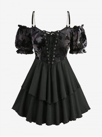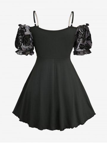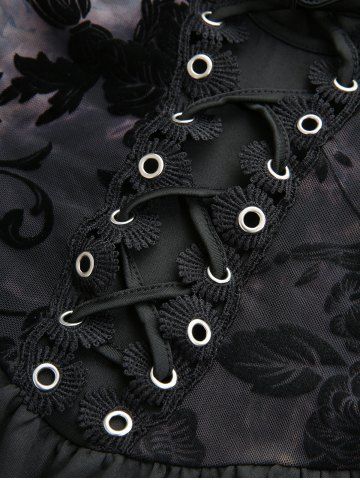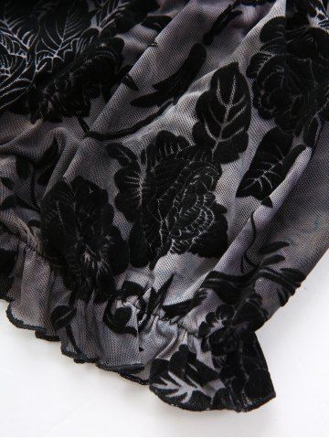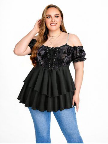 Plus Size Puff Sleeves Floral Mesh Flocking Tie Dye Lace Up Ruffles Layered Chain Cami Top - Black - 5x | Us 30-32