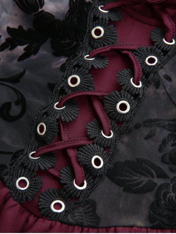 Plus Size Puff Sleeves Floral Mesh Flocking Tie Dye Lace Up Ruffles Layered Chain Cami Top - Deep Red - 5x | Us 30-32