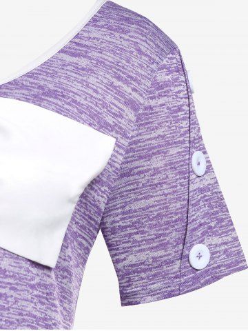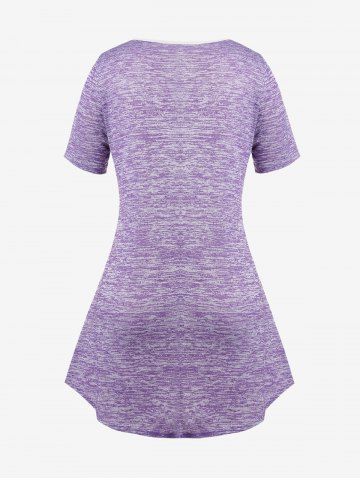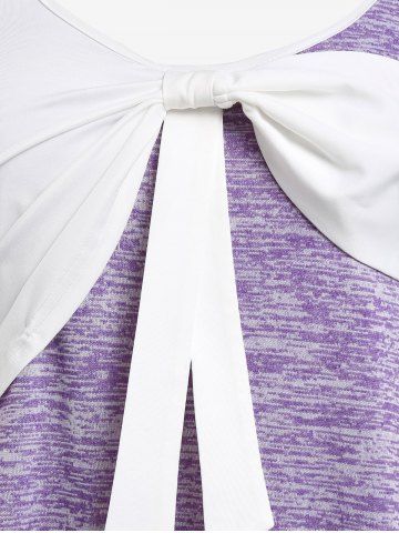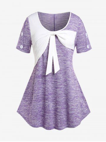 B*****b5Plus Size Space Dye Bowknot T-shirtColor: PURPLE Size: 3XPretty old fashioned designed top with a bow on the front and buttons on the sleeves. The material is soft and comfortable, perfect fit, shipped fast and packaged nicely. High quality design and made very well!