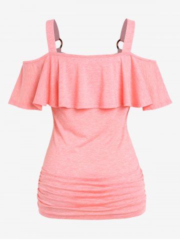 a*****95Plus Size Space Dye Flounce O-rings Cold Shoulder TeeColor: LIGHT PINK Size: 3X | US 22-24I love this shirt it’s comfortable soft and I like it can be wore just everyday or to go out.