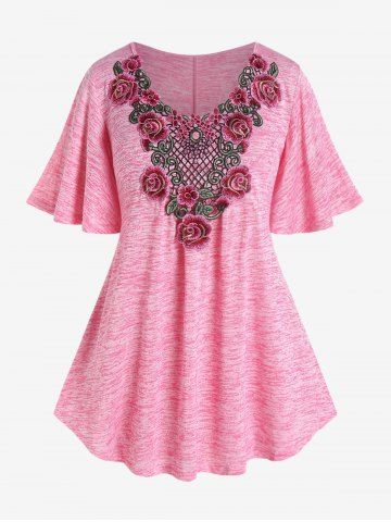 Plus Size T-shirts > Plus Size Space Dye Flower Applique Flutter Sleeves Knitted T Shirt